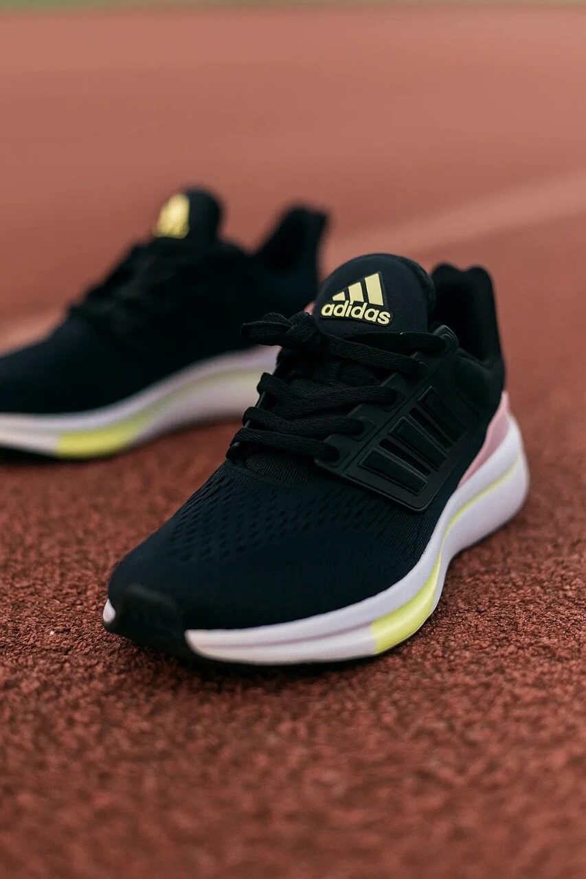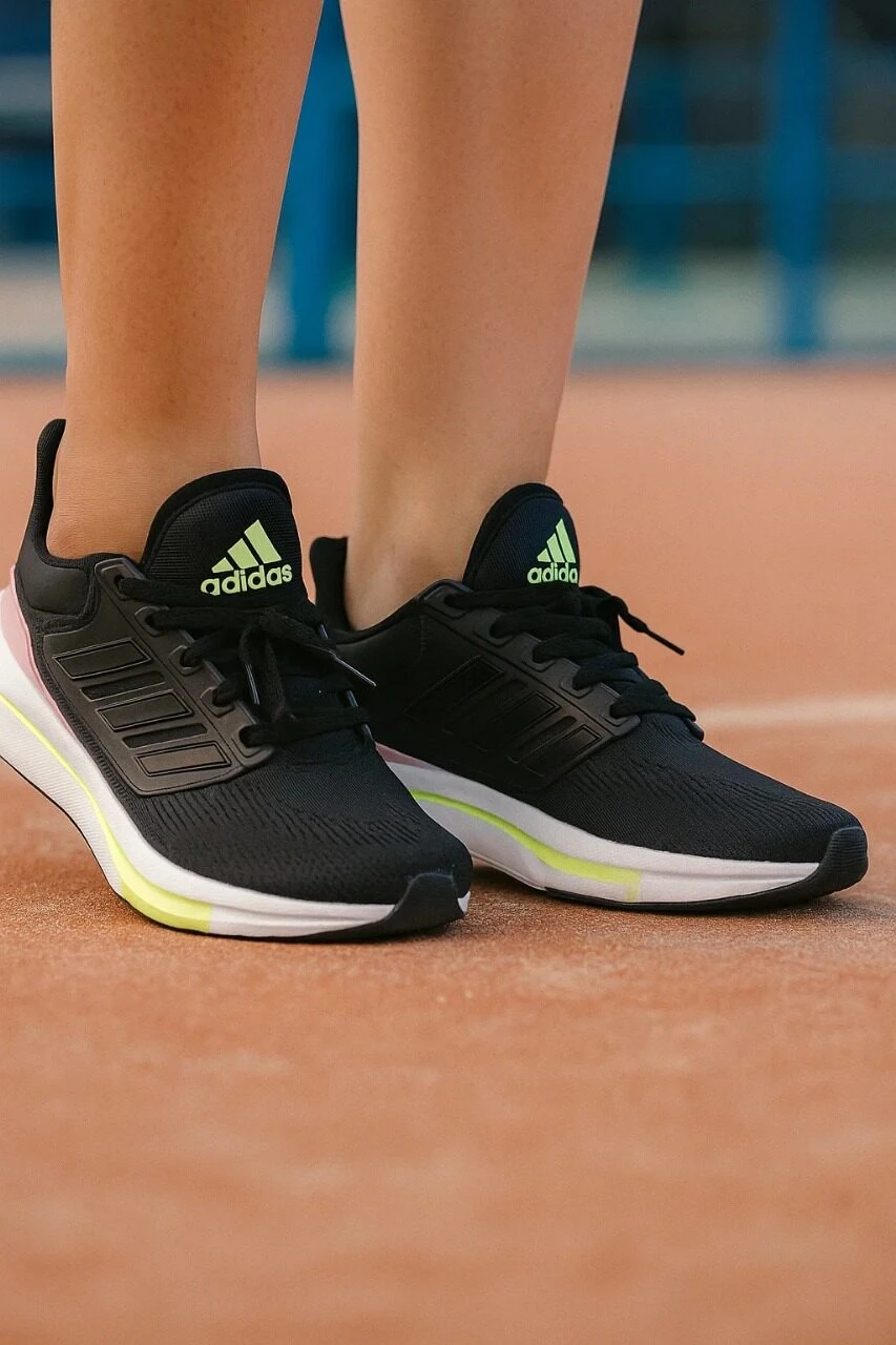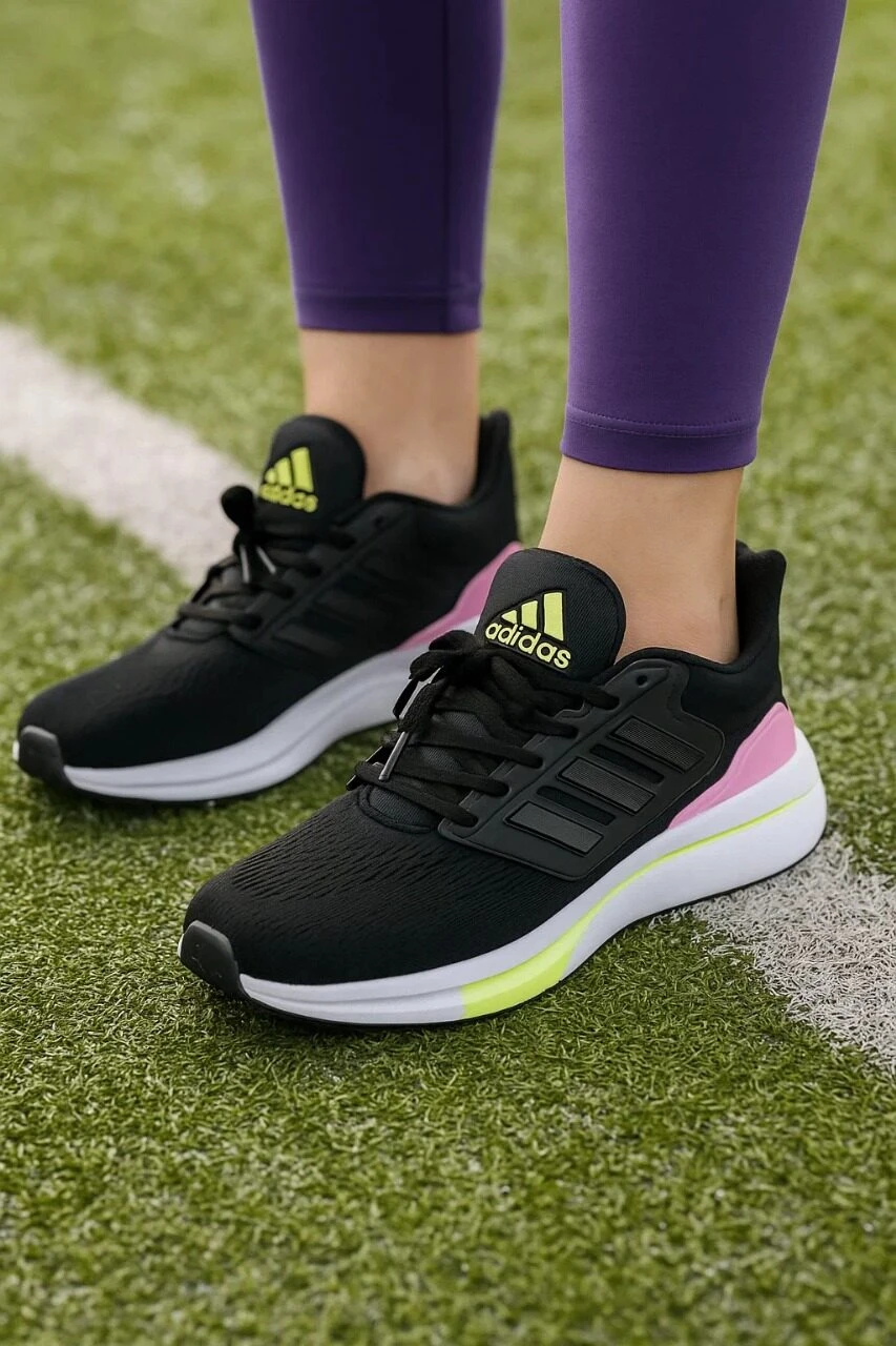 حذاء رياضي أديداس أسود مع لمسات بالنيون الوردي والأصفر – تباين جريء يجمع الأداء بالأناقة