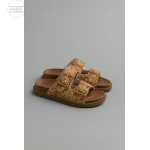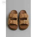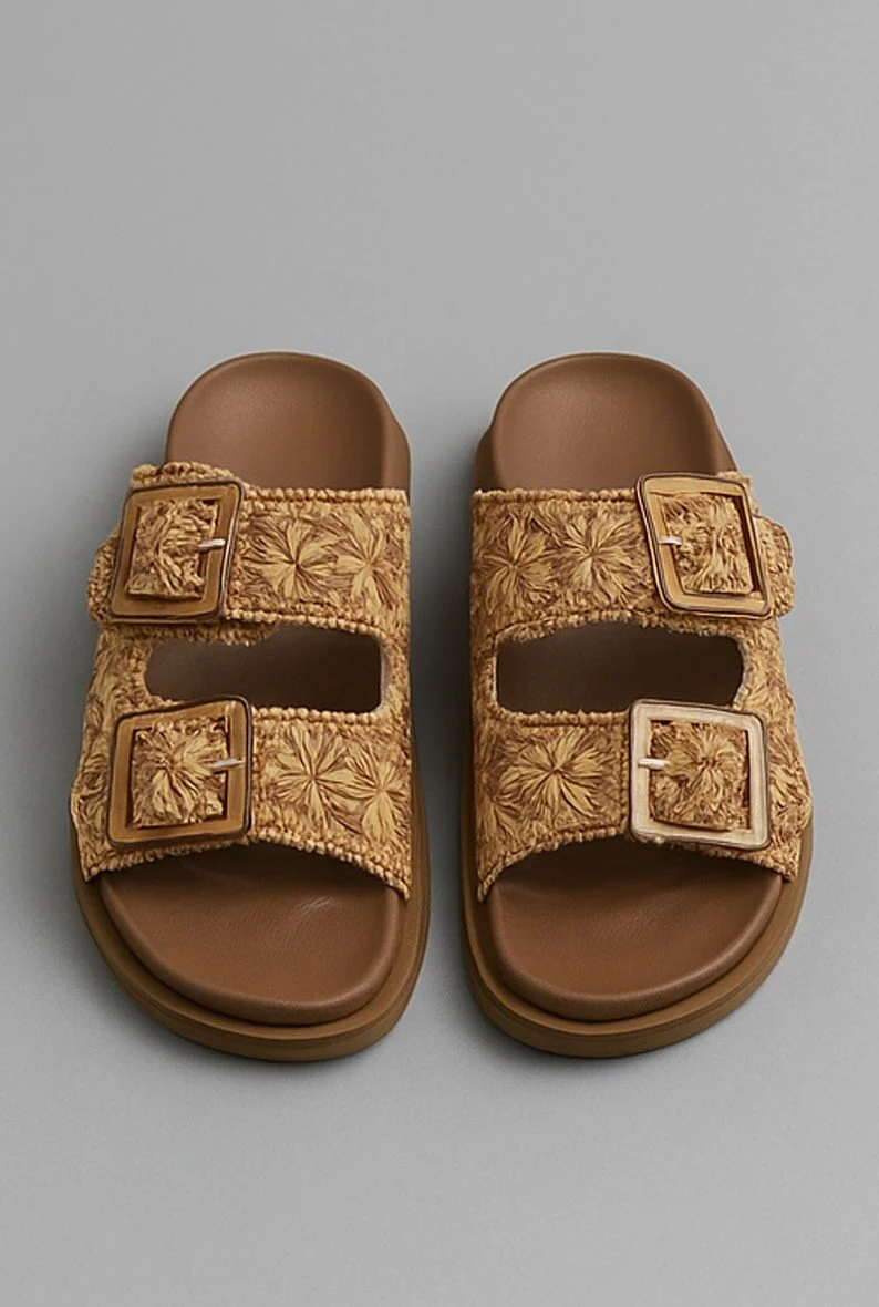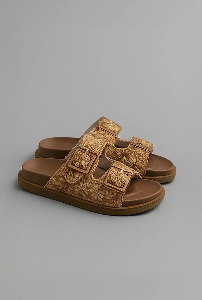 اختاري التميز مع هذا السليبر الفريد بلونه الجملي وتصميمه المنسوج الفاخر. يتميّز بحزامين عريضين مزخرفين بنقشة زهرية باللونين الأبيض والبني الفاتح، مع إبزيمين كبيرين لإطلالة أنيقة وسهلة الارتداء. النعل المسطح يمنحك راحة مثالية أثناء المشي، ما يجعله الخيار الأمثل لإطلالة يومية تجمع بين الأنوثة والراحة.