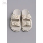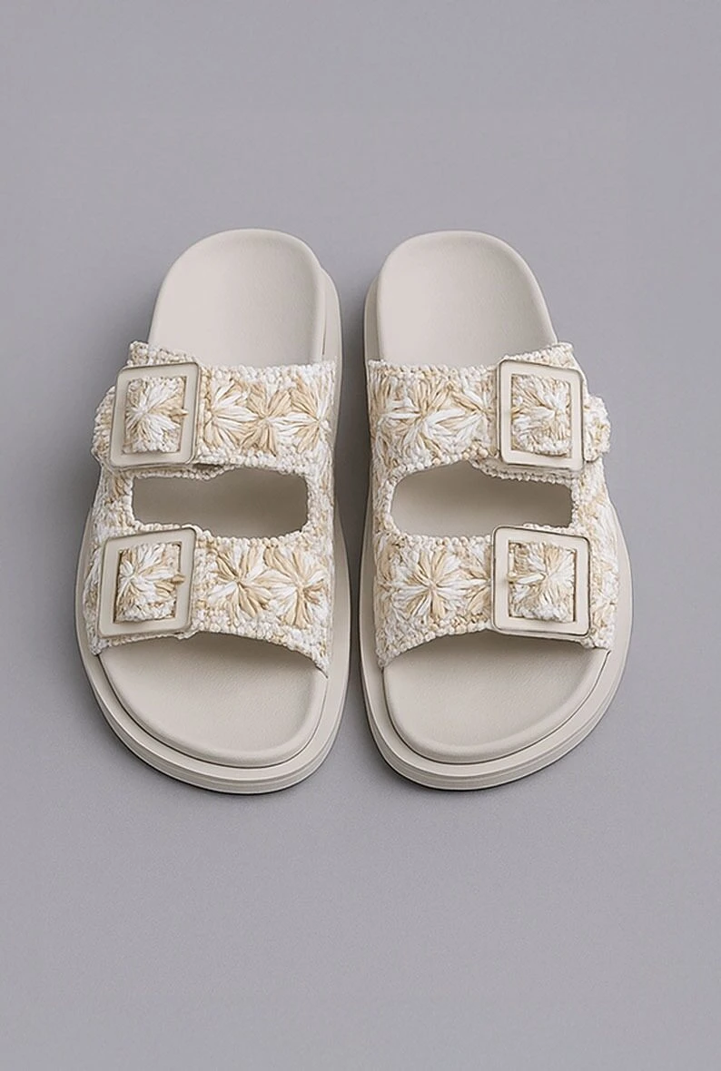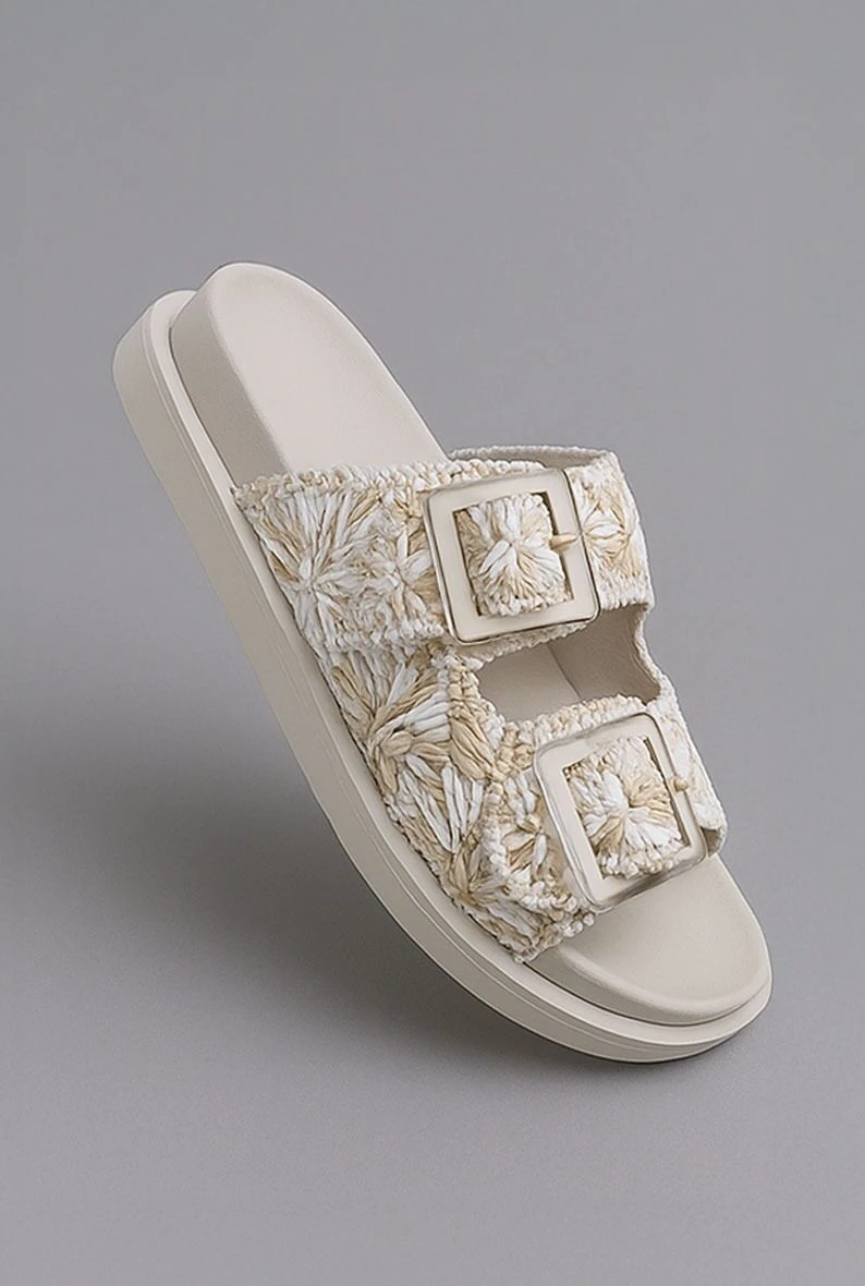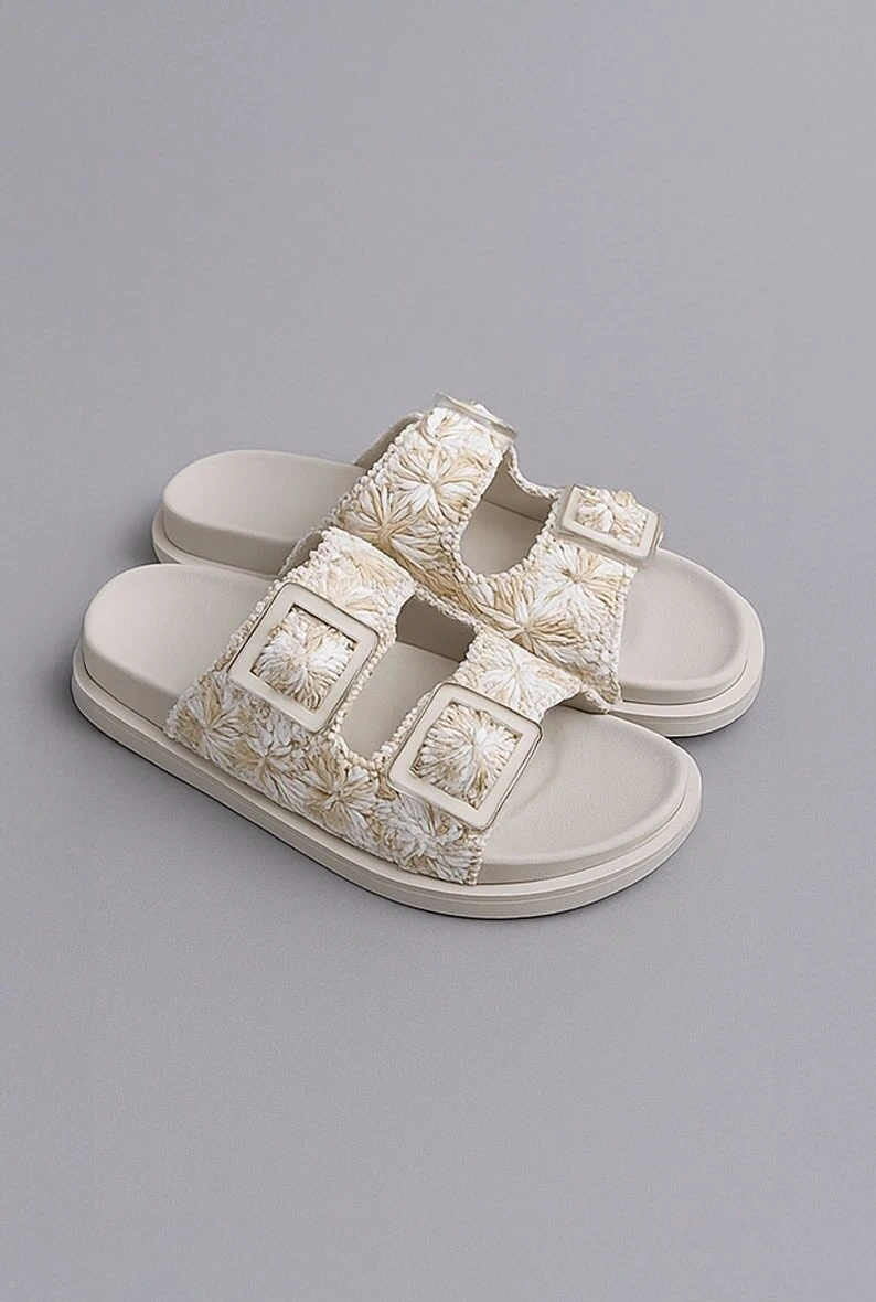 اختاري التميز مع هذا السليبر الفريد بلونه البيج وتصميمه المنسوج الفاخر. يتميّز بحزامين عريضين مزخرفين بنقشة زهرية باللونين الأبيض والبني الفاتح، مع إبزيمين كبيرين لإطلالة أنيقة وسهلة الارتداء. النعل المسطح يمنحك راحة مثالية أثناء المشي، ما يجعله الخيار الأمثل لإطلالة يومية تجمع بين الأنوثة والراحة.