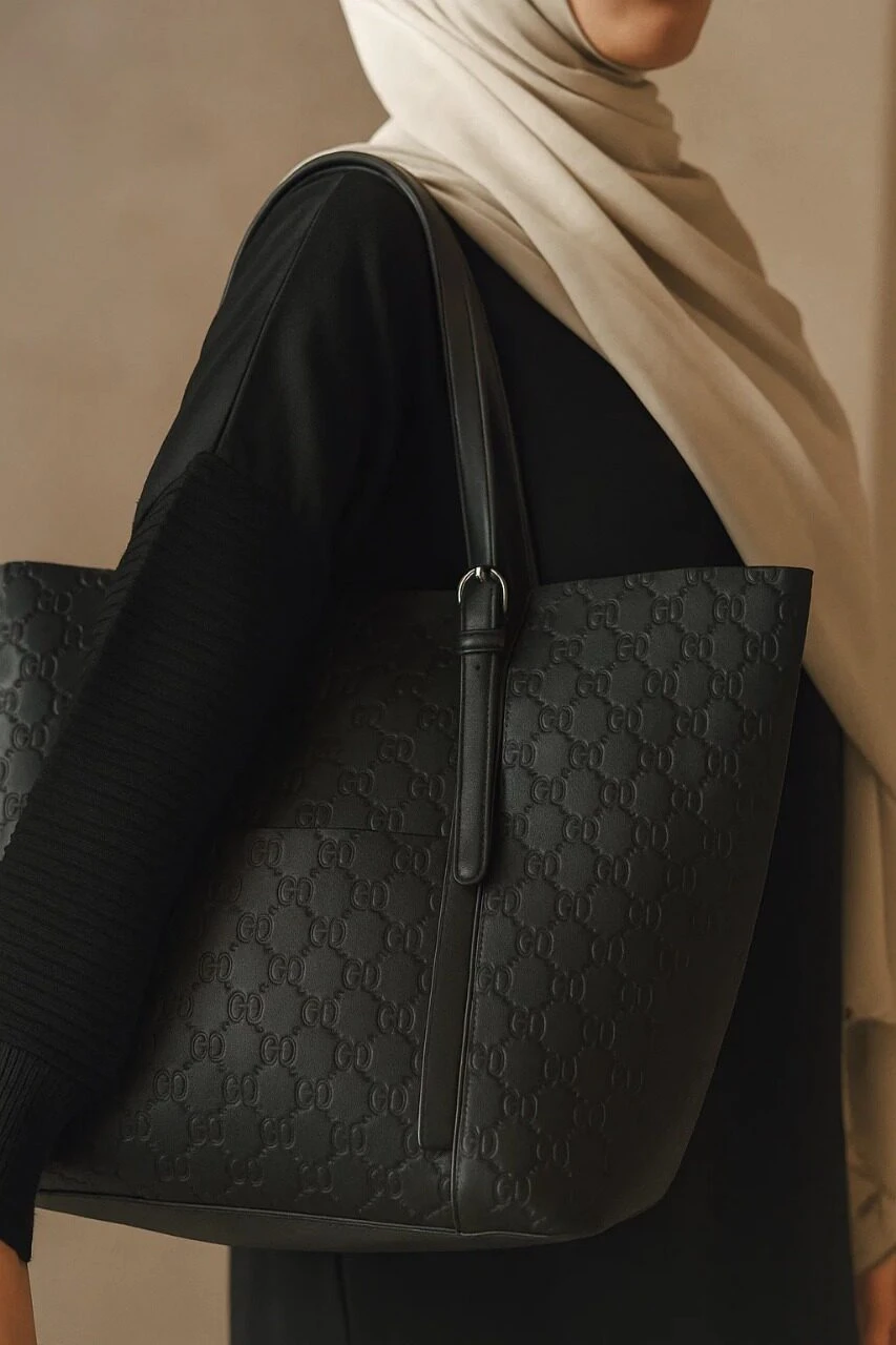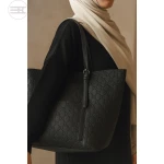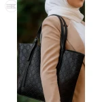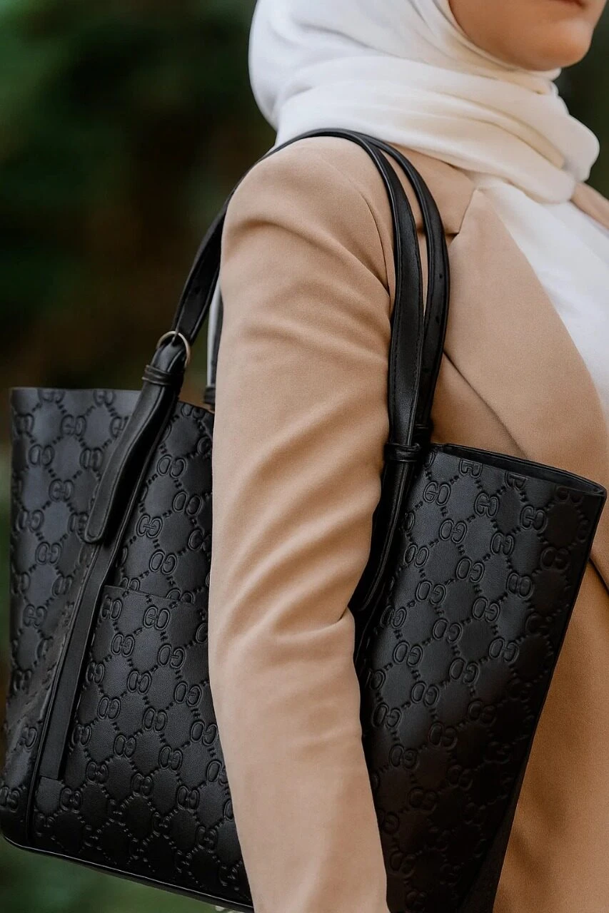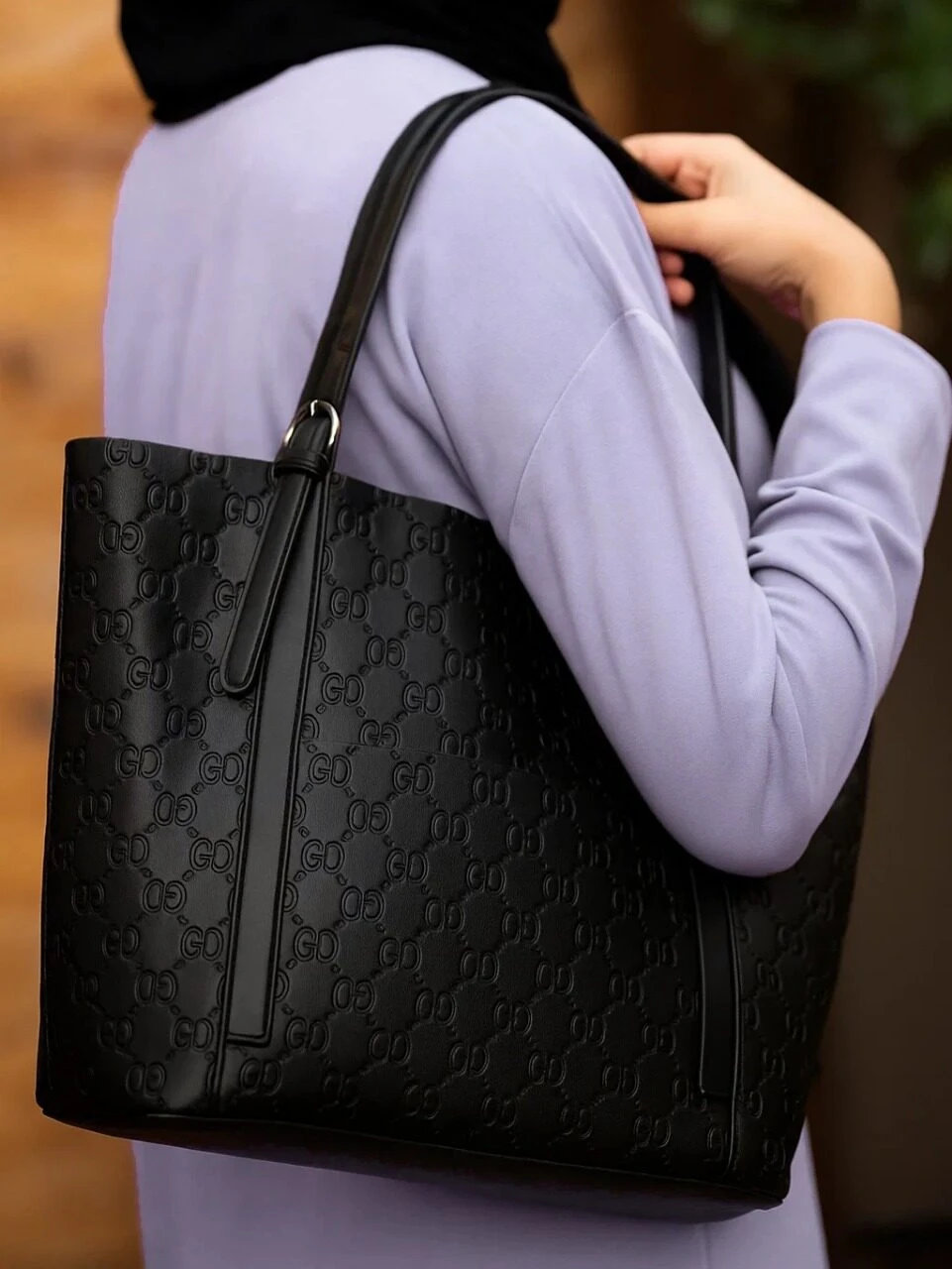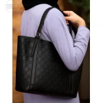 شنطة توت أنيقة باللون الأسود مصنوعة من الجلد الناعم، ومزينة بنقشة GG المتشابكة التي تضفي طابعًا فاخرًا وملفتًا. تتميز بمساحة داخلية واسعة ومقابض كتف مزدوجة توفر راحة في الحمل، مما يجعلها خيارًا مثالياً للارتداء اليومي بأسلوب أنيق يجمع بين البساطة والتميز.
