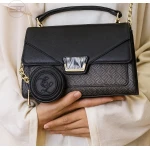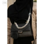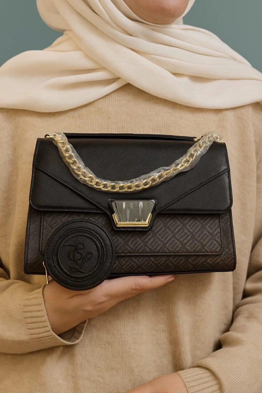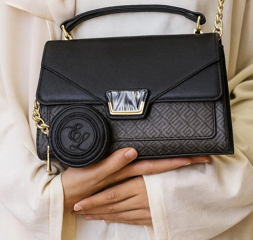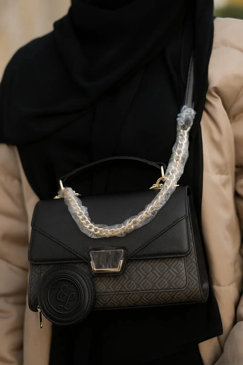 شنطة كتف أنيقة باللون الأسود بتصميم هيكلي فاخر، مزودة بغطاء مزخرف بنقشة الماس وقفل معدني باللون الذهبي يضيف لمسة من الرقي. تأتي مزودة بسلسلة ذهبية أنيقة للحمل، مع تعليقة دائرية قابلة للإزالة من الجلد مزينة بحروف “E L” تمنح الشنطة طابعًا شخصيًا جذابًا، مما يجعلها خيارًا مثاليًا للإطلالات اليومية والمسائية.