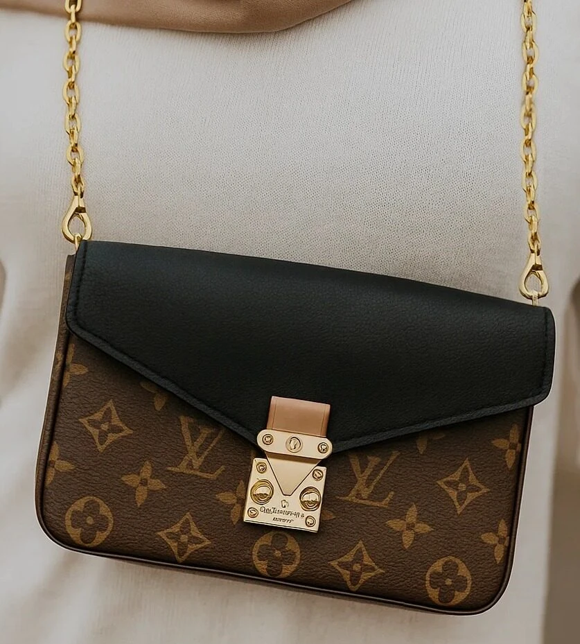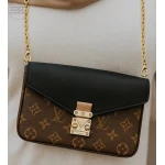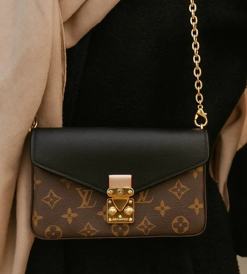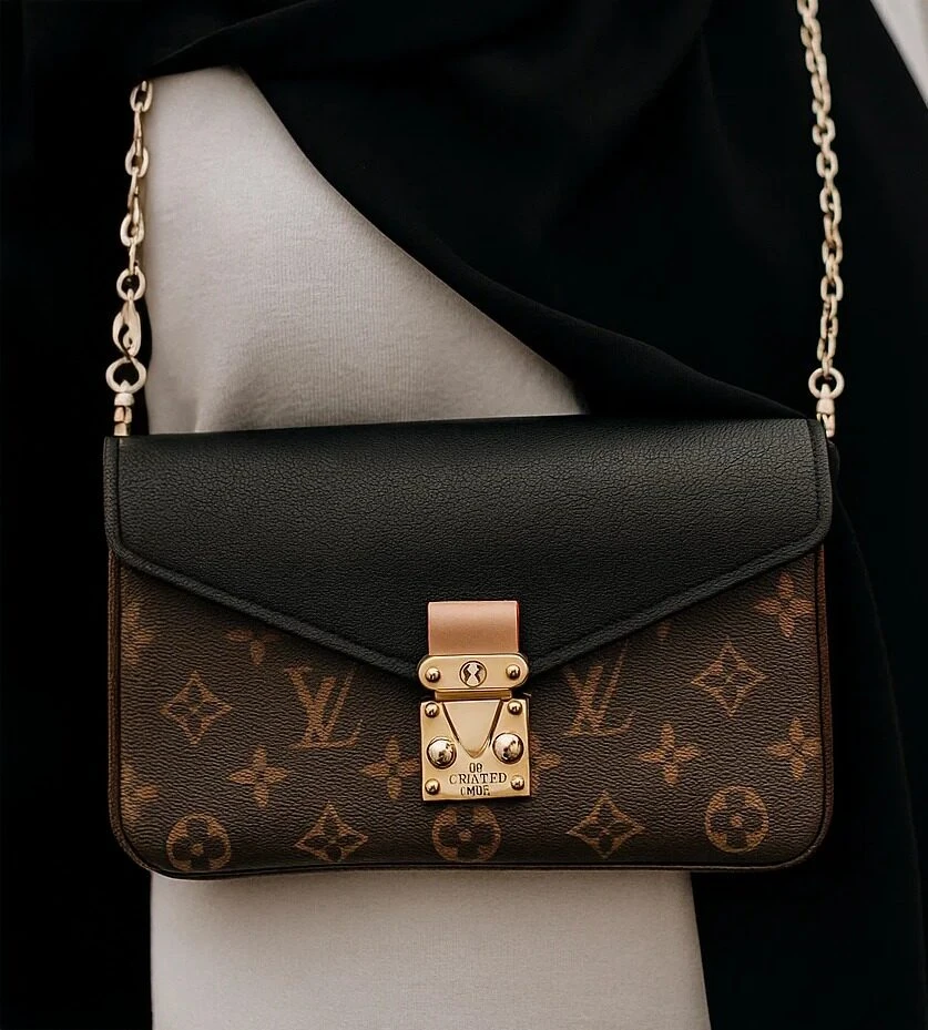 شنطة كتف فاخرة من Louis Vuitton تجمع بين التصميم الكلاسيكي واللمسة العصرية، مصنوعة من قماش المونوغرام الشهير باللون البني الذهبي مع غطاء أنيق من الجلد الأسود. تتزين بسلسلة ذهبية لامعة وقفل أمامي بتصميم أنيق يعكس هوية الدار الفرنسية. تتميز بشكلها الهيكلي الأنيق الذي يناسب الإطلالات اليومية والمناسبات الخاصة، وتضفي لمسة من الرقي والتميز لكل من تبحث عن الفخامة في تفاصيلها.