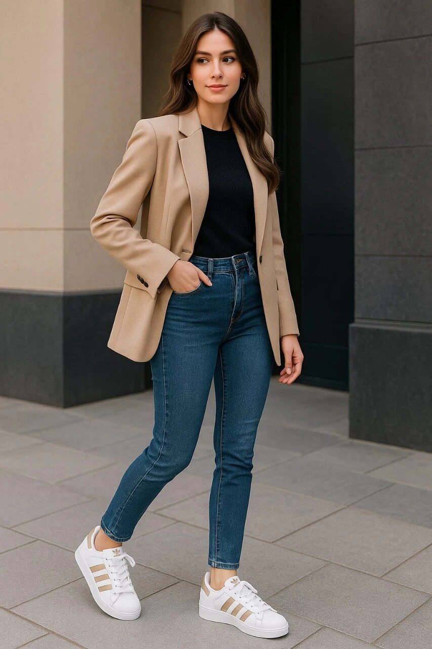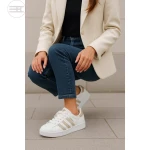 يُقدم هذا الحذاء من أديداس أوريجينالز إعادة تفسير أنيقة وعصرية لأيقونة “سوبرستار” الكلاسيكية، مُضفيًا عليها لمسة من الرقي الهادئ. يتميز الجزء العلوي المصنوع من الجلد الصناعي عالي الجودة باللون الأبيض الناصع، والذي يتناغم ببراعة مع الخطوط الثلاثة الأيقونية والشعار المطبوع على الجانب باللون البيج الدافئ أو “الكافيه الفاتح”. هذا التدرج اللوني يمنح الحذاء مظهرًا ناعمًا ومتميزًا، بعيدًا عن التباين الصارخ، مما يجعله مثاليًا لإطلالات عصرية وأنيقة.