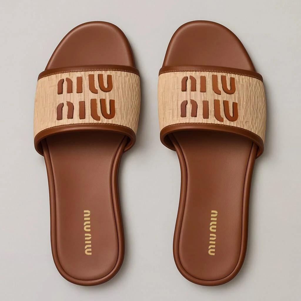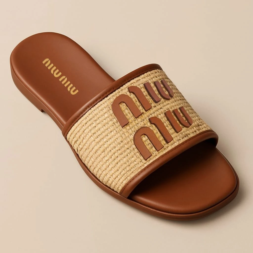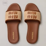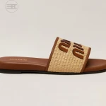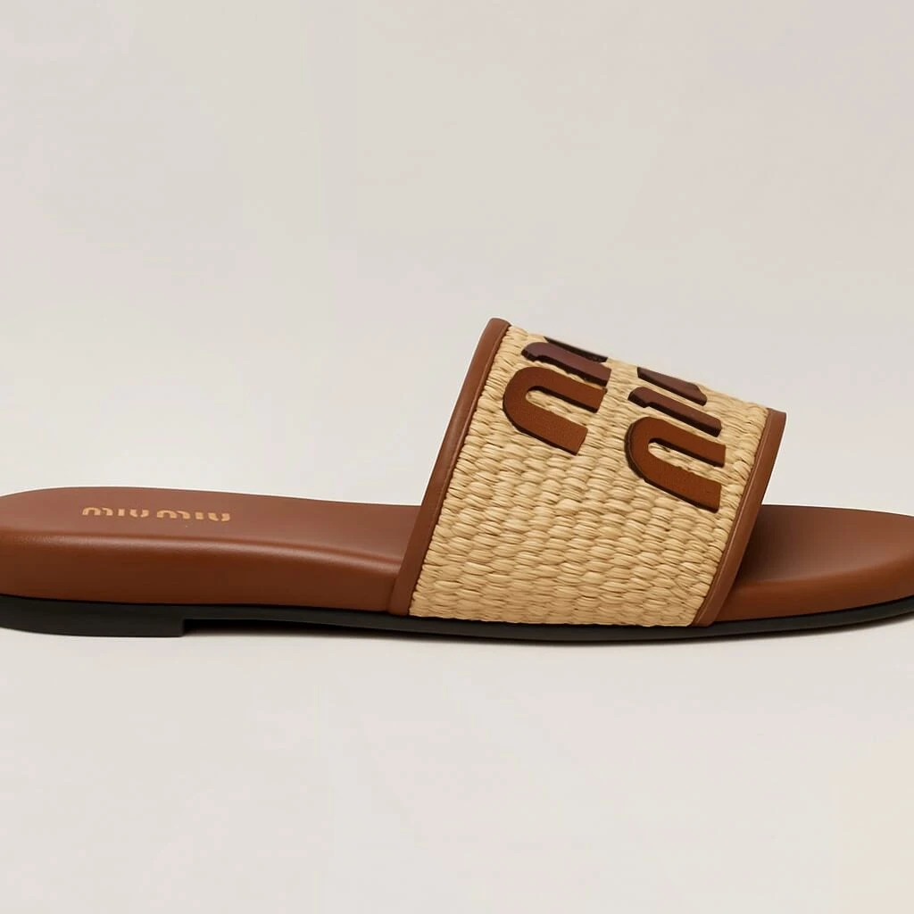 يأتي بحزام علوي من خامة الرافيا المجدولة بلون بيج، مزين بشعار Miu Miu البارز بلون جملي متناسق، مع نعل داخلي مريح ومبطن بلون بني دافئ.
