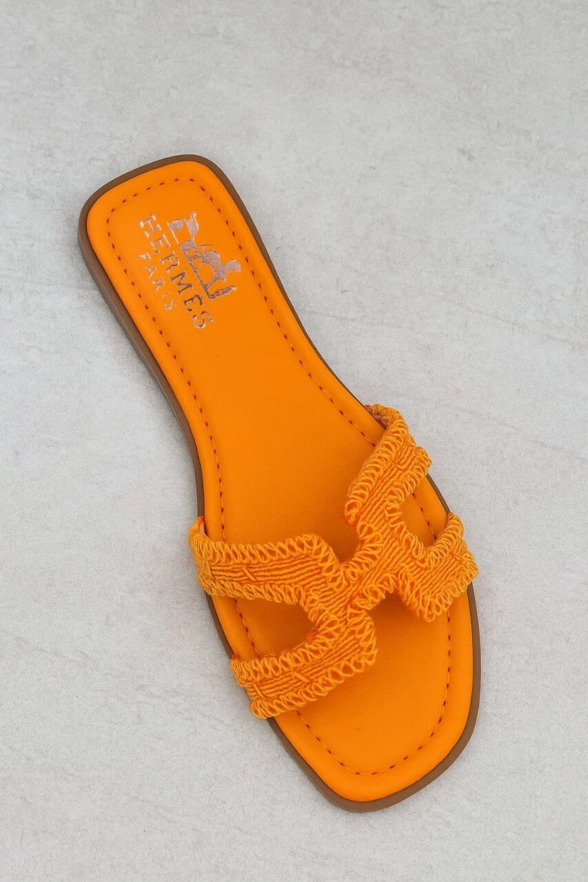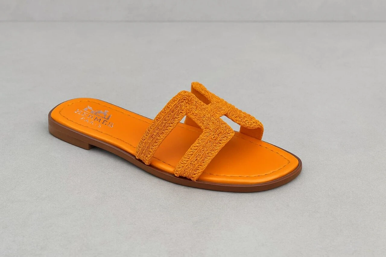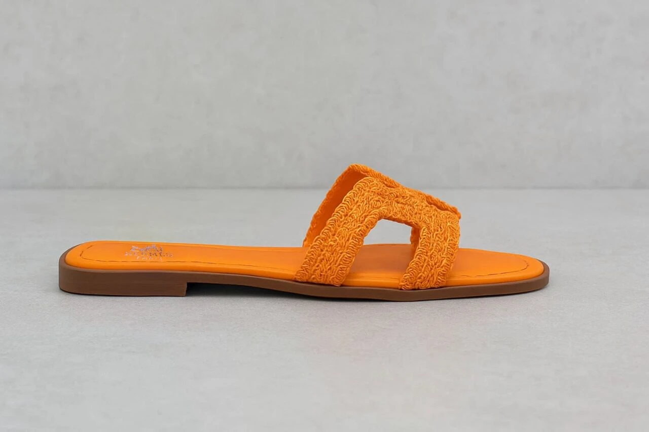 صندل نسائي مسطح باللون البرتقالي الزاهي، يجسد الأناقة العصرية والراحة المطلقة. يتميز هذا الصندل بتصميم أيقوني على شكل حرف “H” مصنوع من خامة منسوجة أو مضفرة بدقة، مما يضفي لمسة فريدة من الفخامة والتميز. يوفر النعل المسطح راحة مثالية للارتداء طوال اليوم، بينما يضمن اللون البرتقالي الجذاب إطلالة صيفية مشرقة ومفعمة بالحيوية. قطعة أساسية لا غنى عنها لإضافة لمسة من الرقي إلى إطلالاتك اليومية أو لقضاء العطلات.
