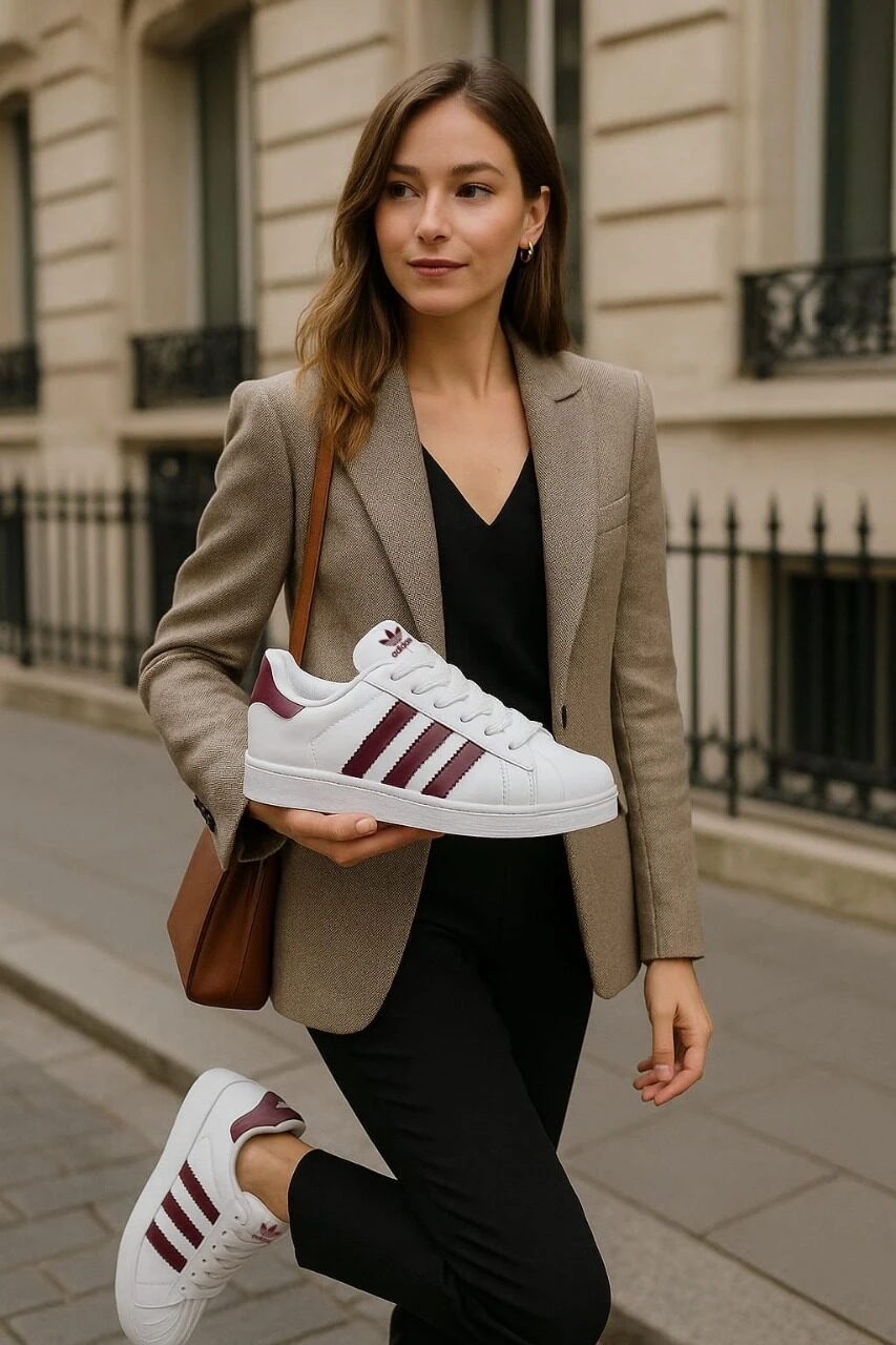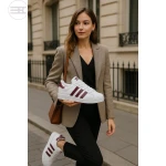 This Adidas Originals shoe offers a bold and elegant blend of athletic flair and iconic design, embodying the rich heritage of the classic “Superstar” model with a modern color twist. It features a pristine white high-quality synthetic leather upper, beautifully highlighted by the iconic three stripes and the printed logo on the side in a rich and deep “Burgundy” color. This striking color contrast between pure white and dark burgundy gives the shoe an attractive and distinctive look, perfect for adding a touch of sophistication and elegance to any outfit.