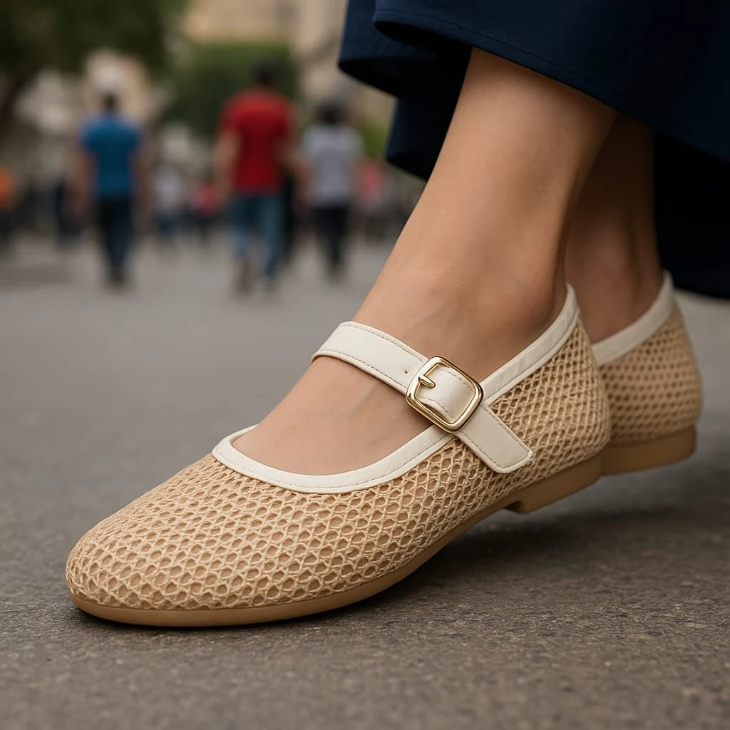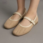 Slip into this soft beige Mary Jane flat featuring a breathable mesh upper and a classic rounded toe. The top strap is secured with a delicate side buckle, combining feminine charm with functionality. With its light structure and low heel, it delivers all-day comfort, making it a graceful companion for both casual days and polished looks.