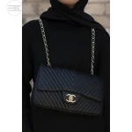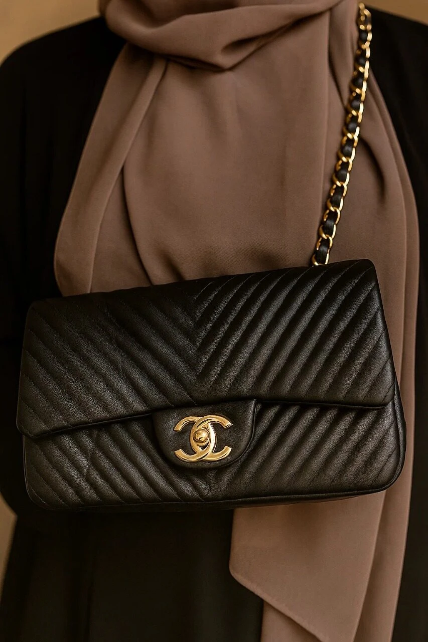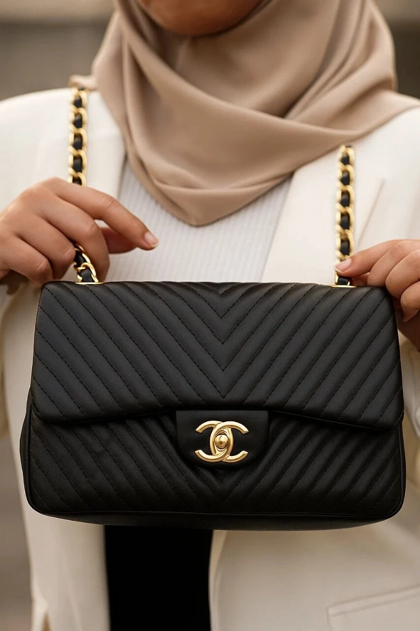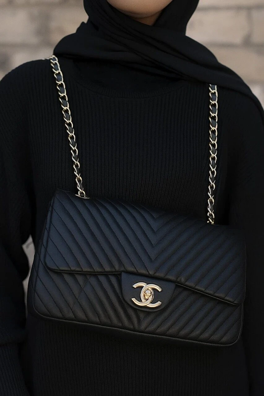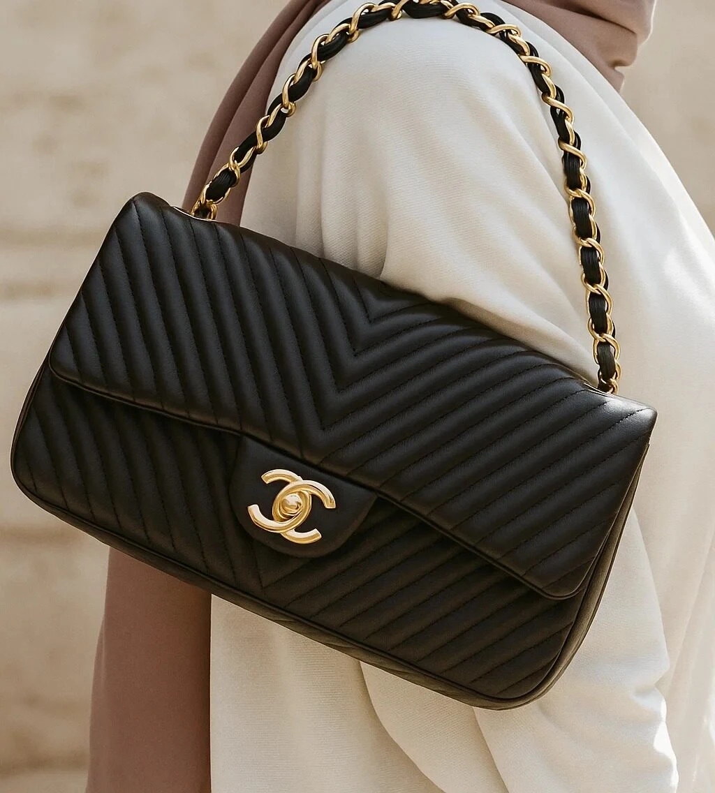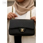 Elevate any ensemble with this iconic Chanel handbag, crafted in luxurious black leather with a sophisticated chevron quilted texture. The signature gold interlocking “CC” clasp adds timeless elegance, while the leather-interwoven chain strap ensures graceful wear on the shoulder or crossbody. A statement piece that merges heritage style with modern refinement, designed for those who appreciate classic luxury with unmistakable flair.