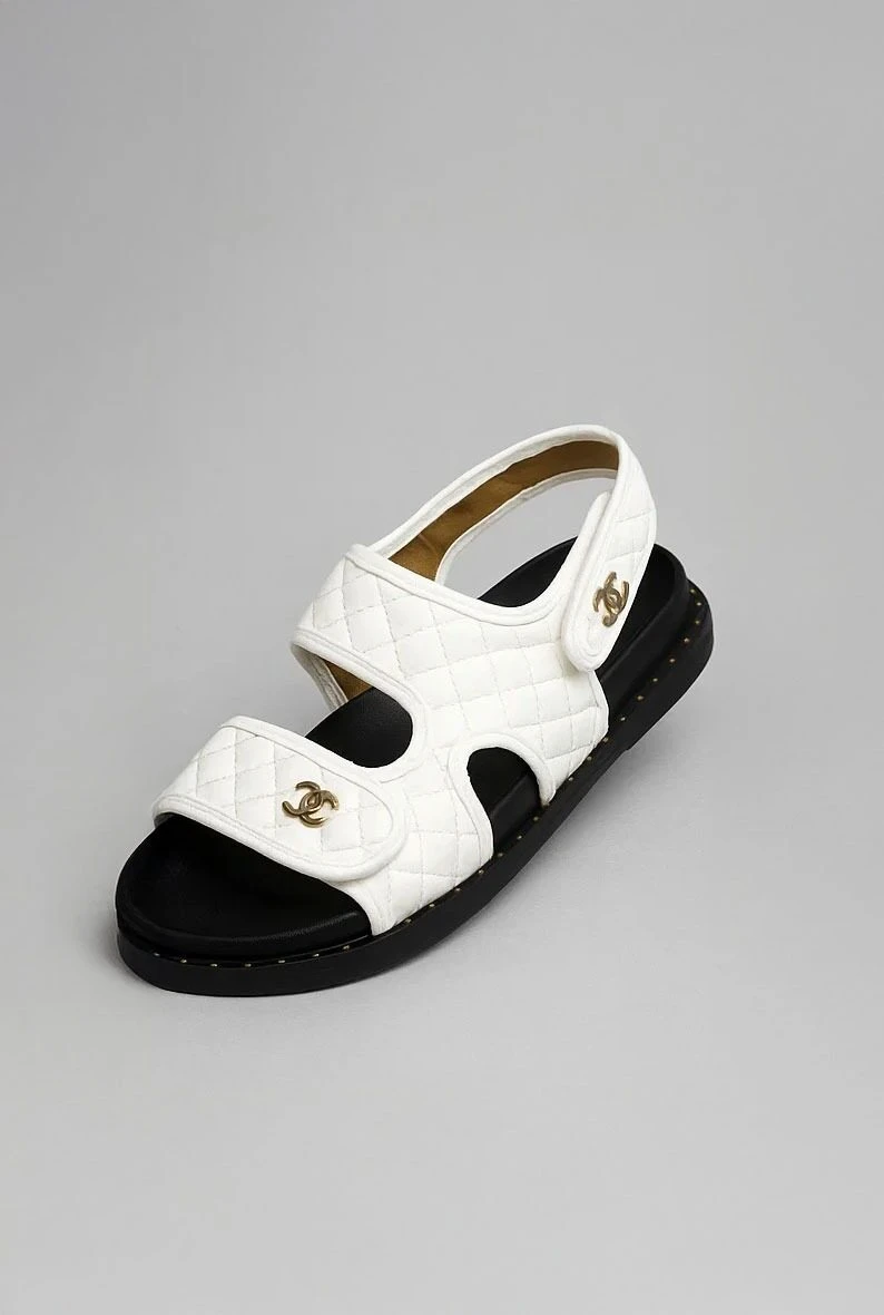 Step into elegance with these exquisite Chanel sandals, crafted from premium white quilted leather. Featuring two adjustable straps adorned with the iconic gold Chanel logo, these sandals effortlessly blend luxury with everyday comfort. The black sole, highlighted with refined gold stitching, adds a sophisticated contrast. Perfect for casual chic looks, this timeless pair delivers both style and versatility for any wardrobe.