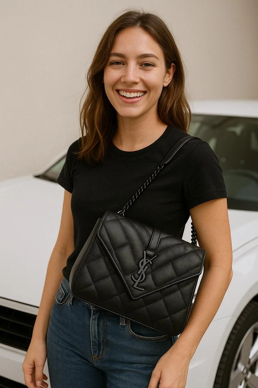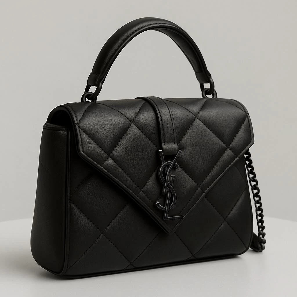 This elegant piece features a high-quality quilted leather finish with a signature envelope-style flap, adorned with the iconic matte black YSL logo.