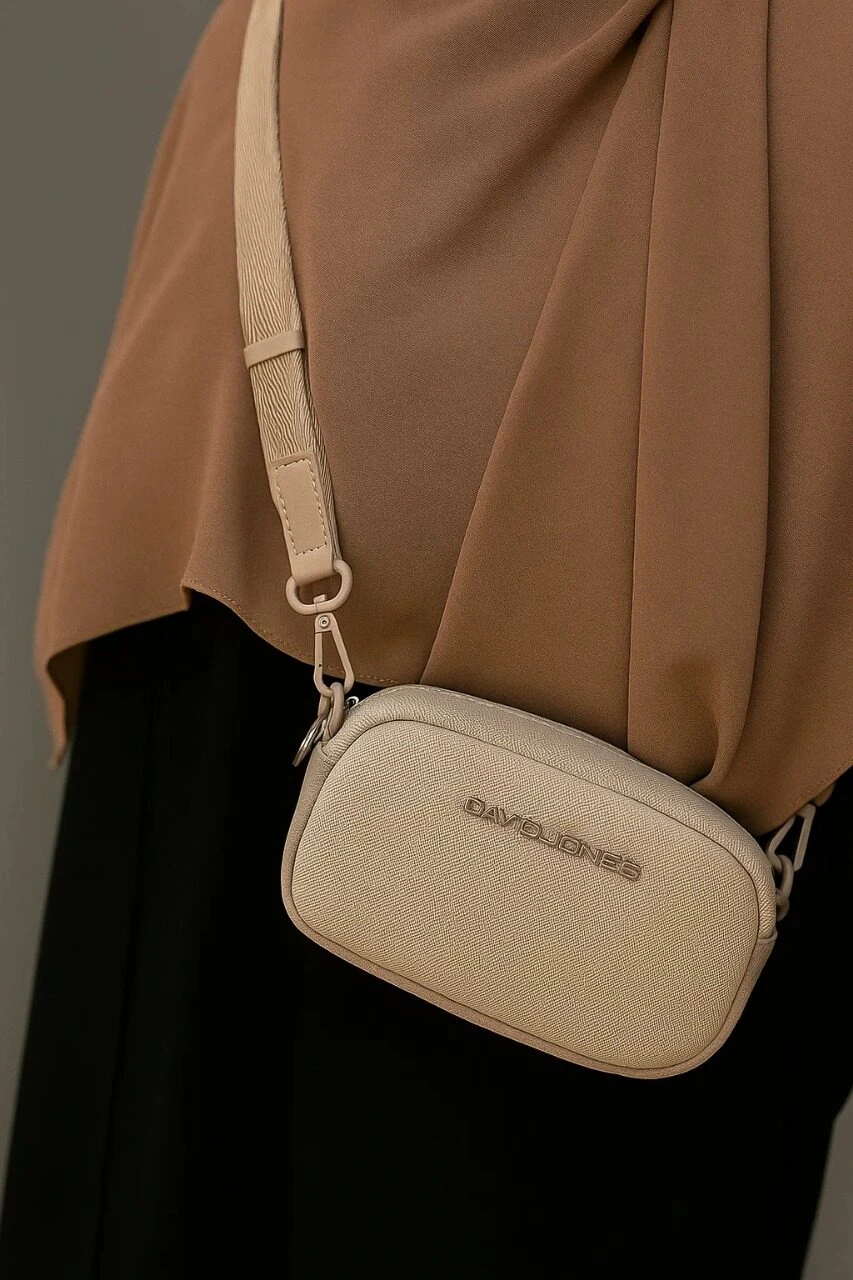 A chic mini crossbody bag by David Jones, crafted with a blush beige for a softly elegant finish. The gold “DAVID JONES” logo adds a refined highlight, while the adjustable beige strap ensures versatile styling and all-day comfort. Perfectly sized to carry your essentials, this compact bag offers effortless charm with a modern, feminine touch.