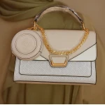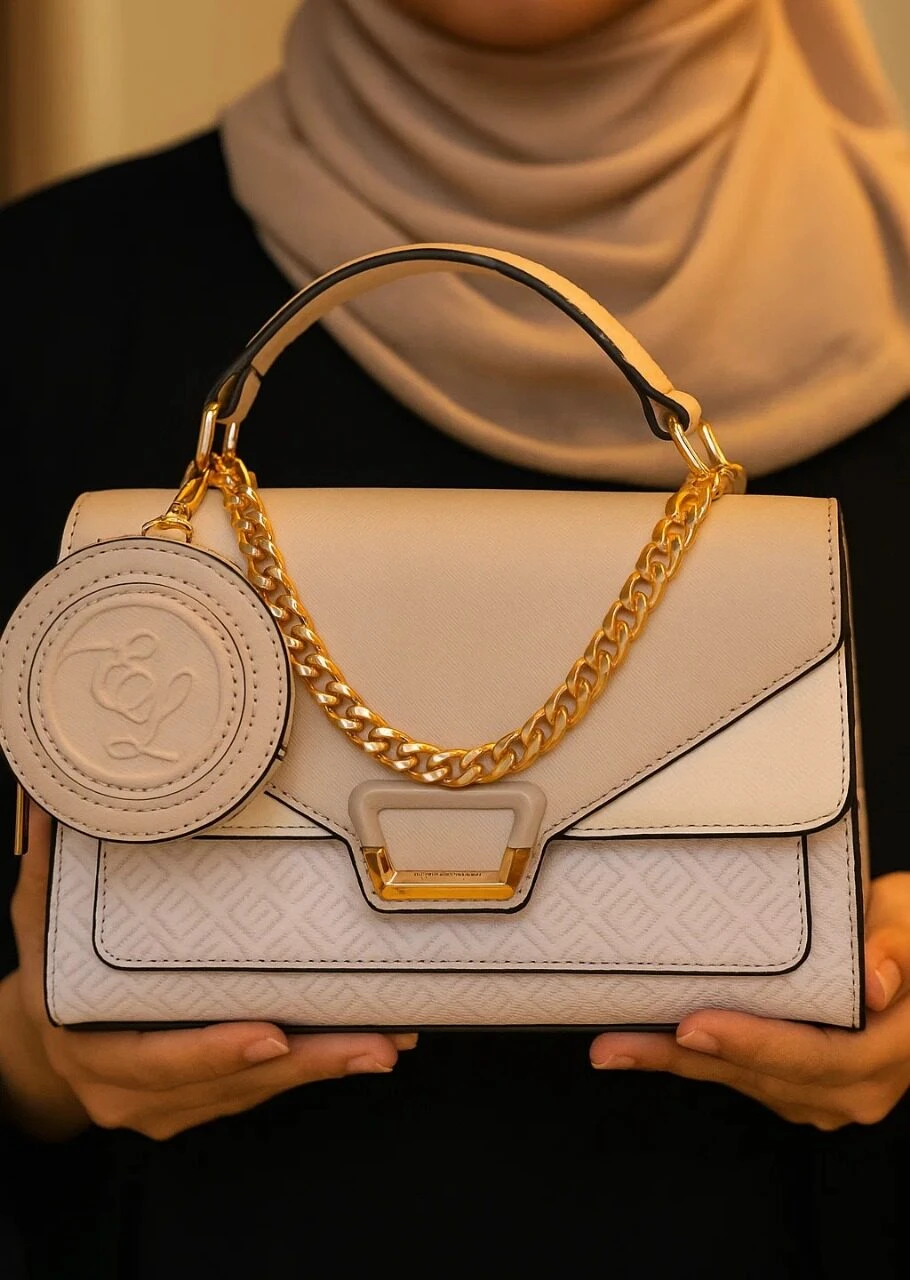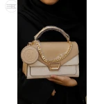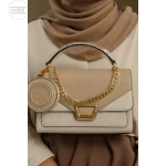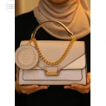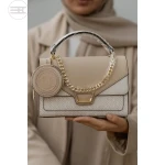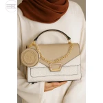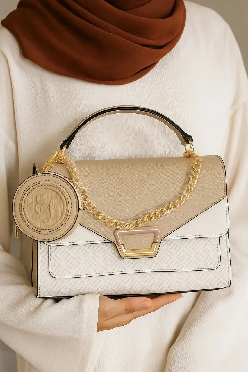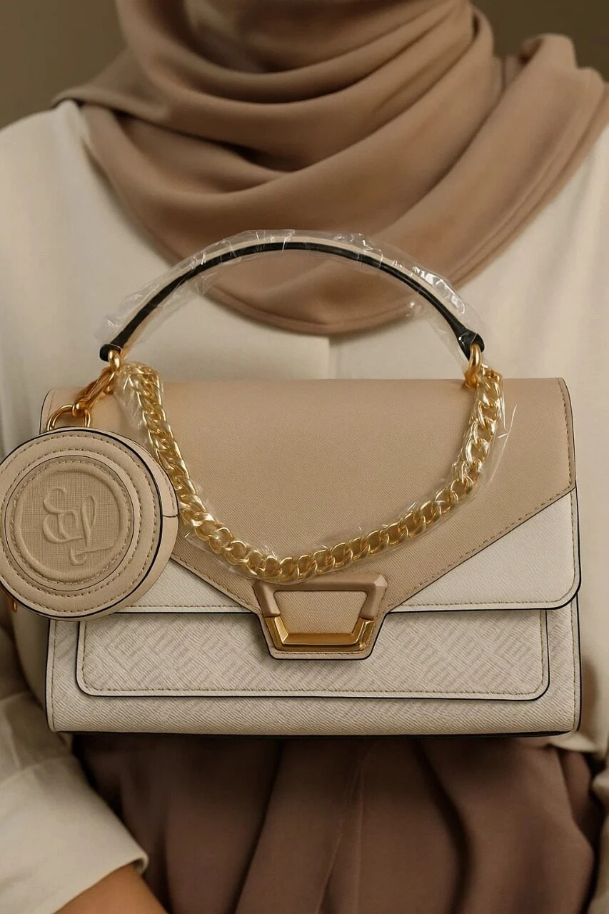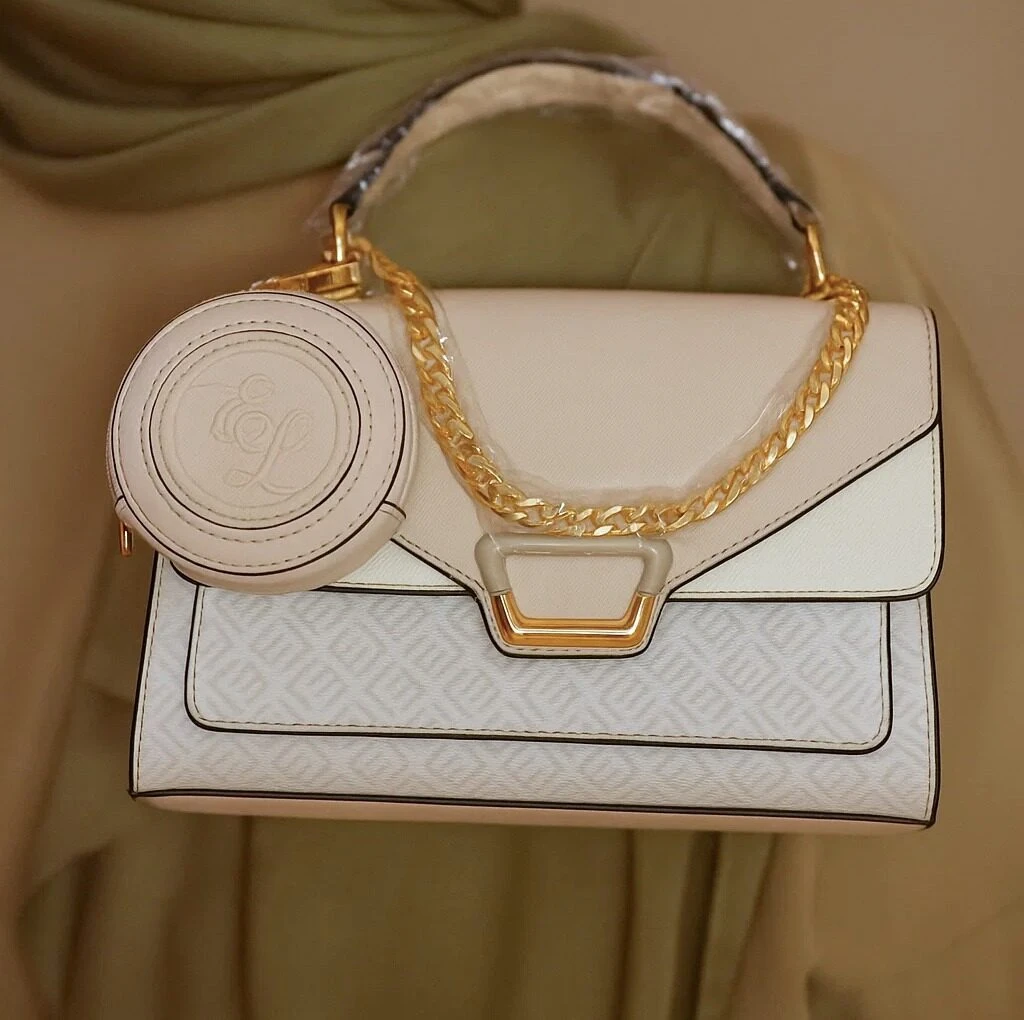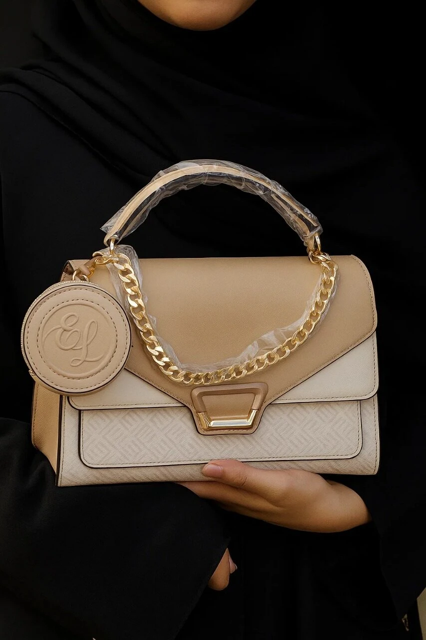 This elegant Beige shoulder bag features a structured silhouette with a diamond-patterned flap and a polished gold-tone clasp that exudes sophistication. A detachable round leather charm embossed with “E L” adds a personalized touch, while the gold-tone chain strap offers a stylish and versatile way to carry it from day to night.