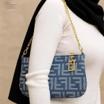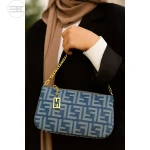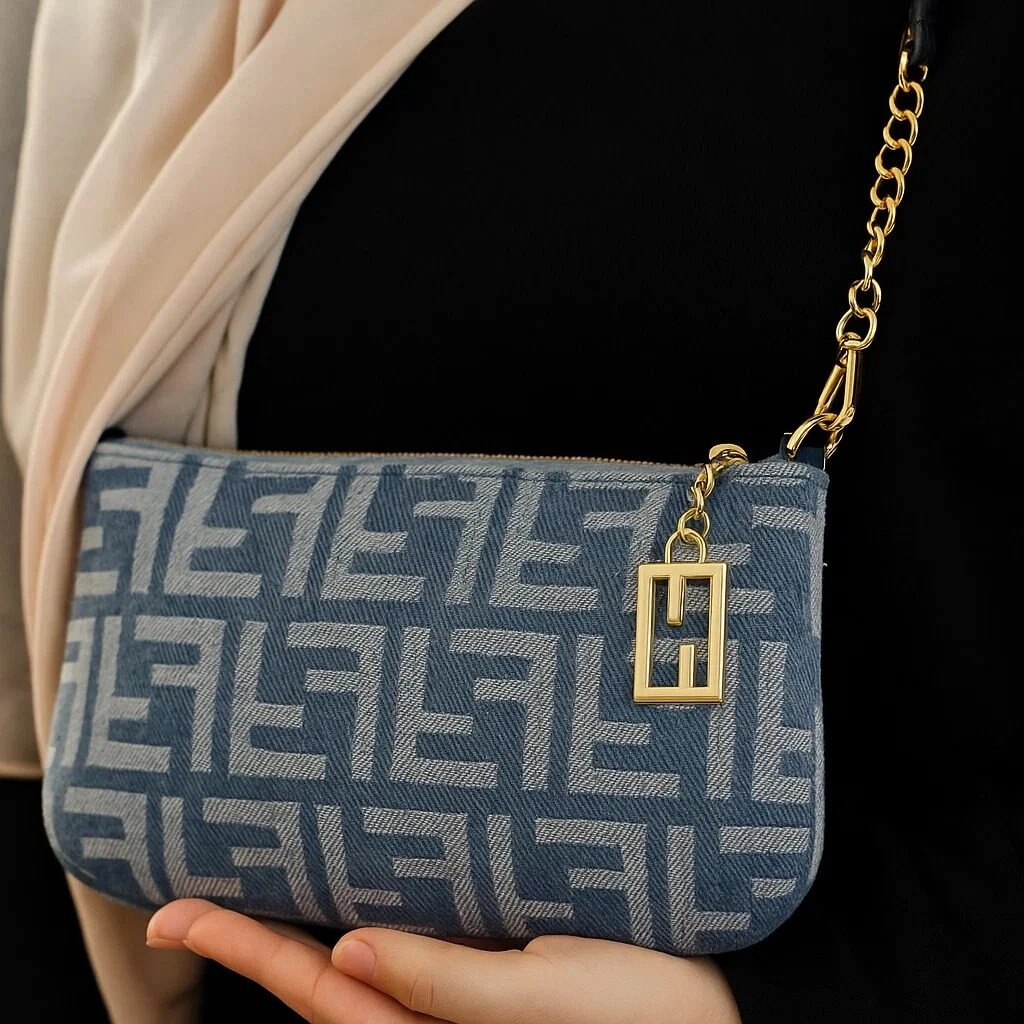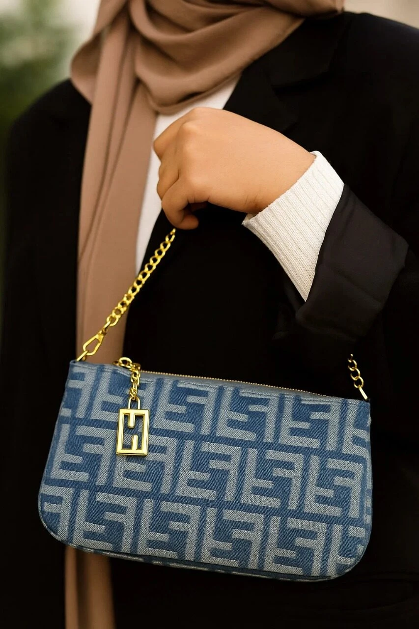 A stylish blue shoulder bag featuring a repeated interlocking monogram print in soft tones, paired with a gleaming gold chain strap and a matching charm with an elegant cutout design. Sophisticated yet modern, this bag adds a distinctive touch to any outfit, balancing visual texture with refined metallic detailing for a versatile look that transitions effortlessly from day to night.