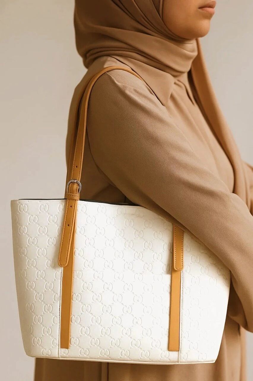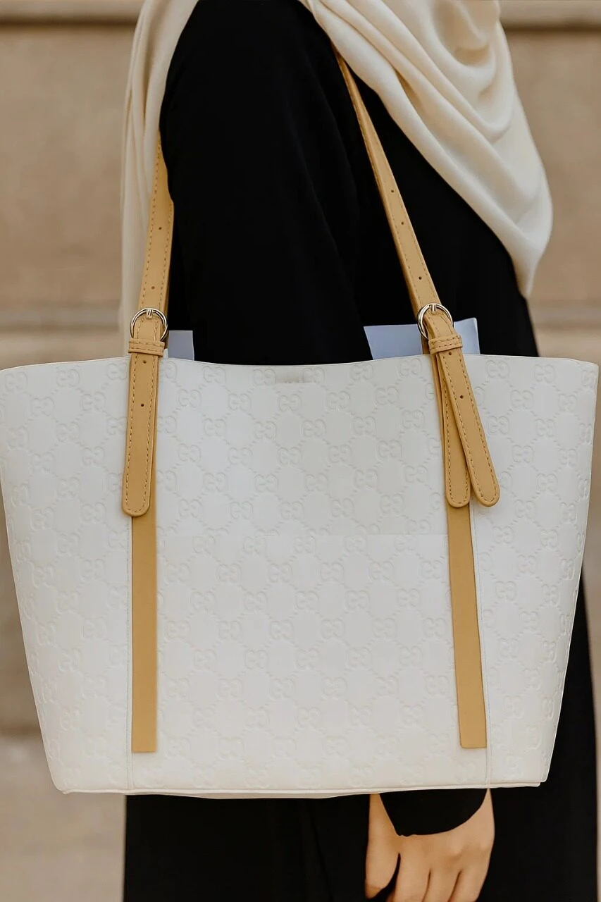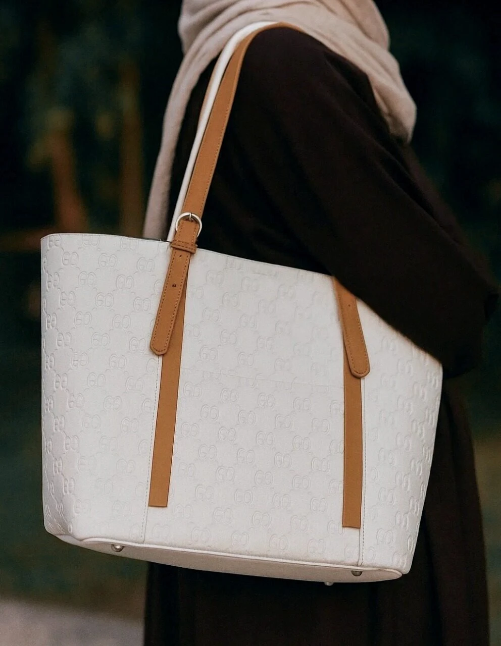 This sophisticated white tote bag combines timeless style with everyday practicality, featuring an embossed interlocking “GG” motif across its smooth leather surface. With dual shoulder straps and a spacious interior, it’s designed to offer comfort, elegance, and iconic appeal—ideal for elevating any daily ensemble with subtle luxury.