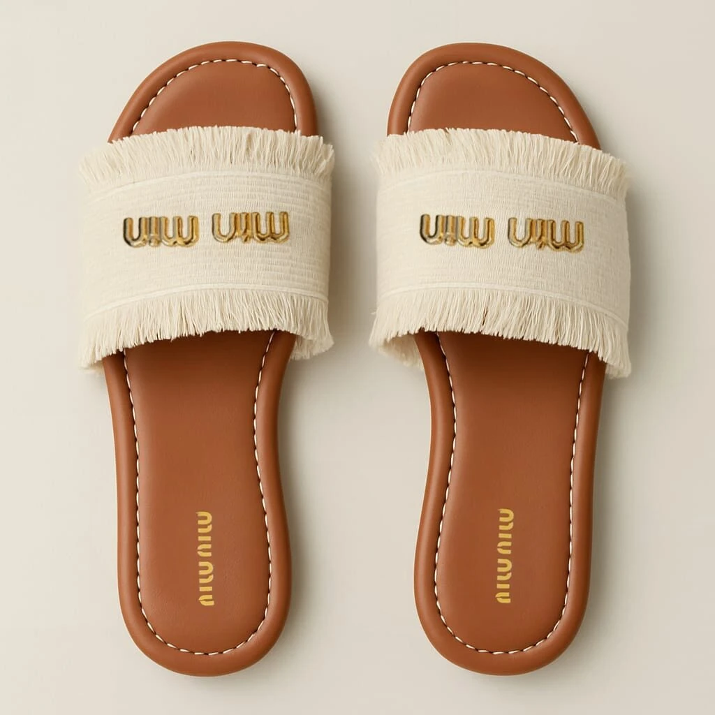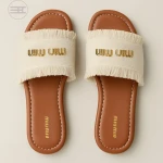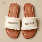 Miu Miu Fringed Flat Slide – Beige & Tan