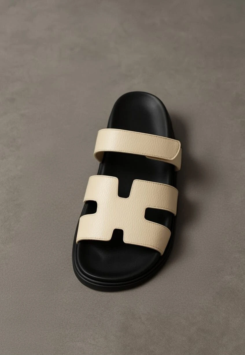 The slipper comes in a warm and uniform beige color, covering both the upper straps and the thick sole, giving it a serene and versatile character that is easy to pair with various outfits. It features a two-strap design: the front strap has a modern, cutout “H” shape covering the forefoot, while the second strap is adjustable (possibly with hidden Velcro) to ensure a perfect fit and supreme comfort.