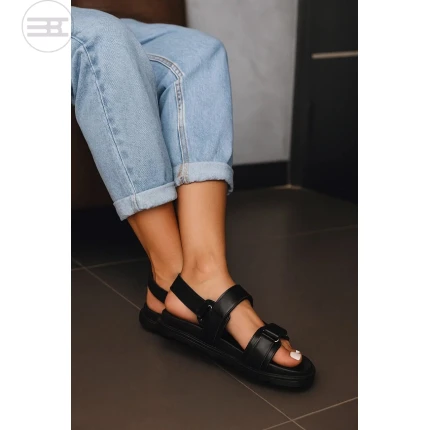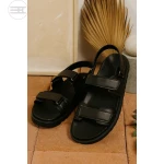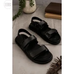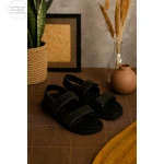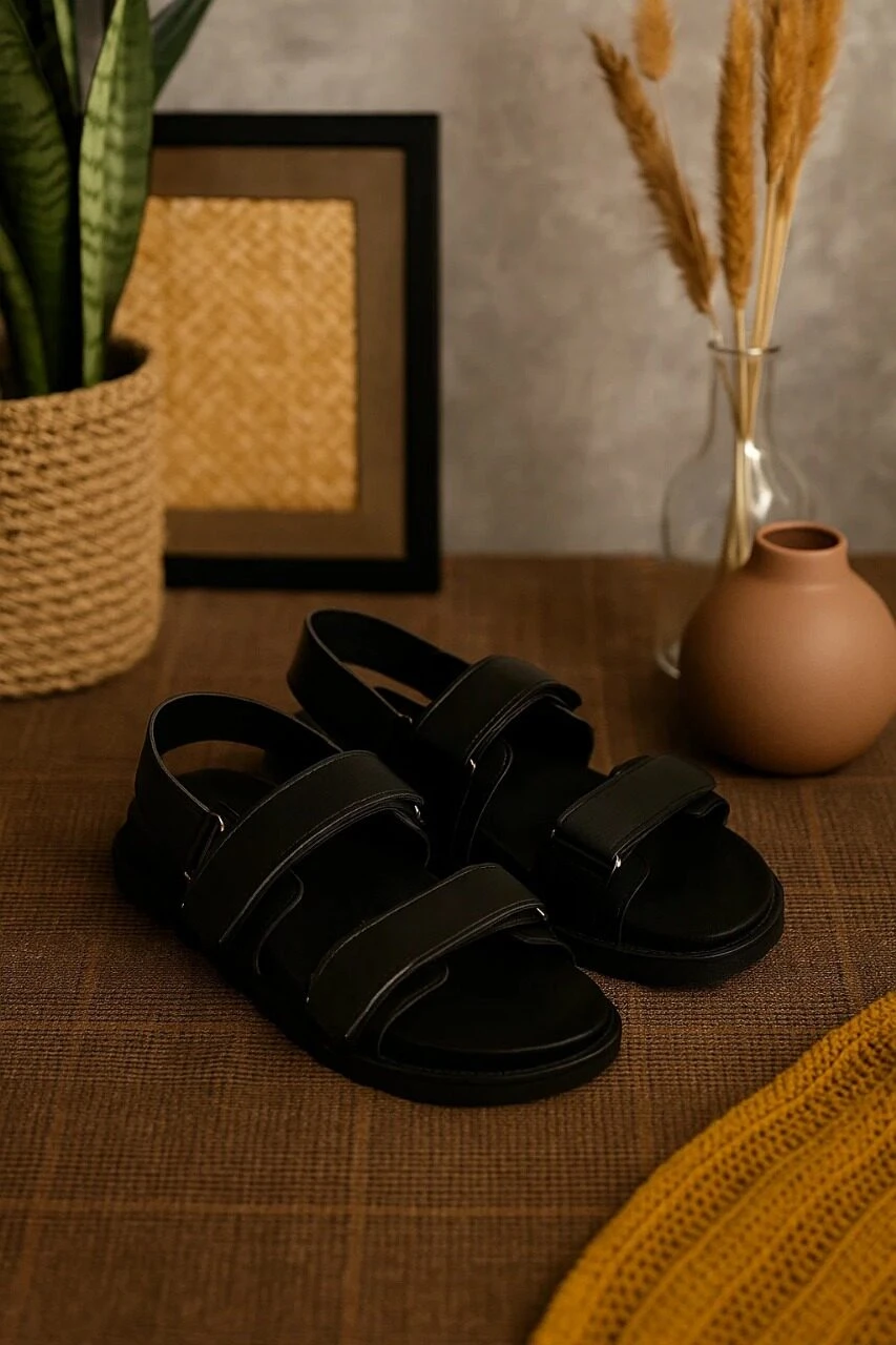 The sandal features a deep, uniform black color, covering both the thick straps and the prominent sole, which gives it a bold, contemporary character that is easy to pair with various outfits. It boasts a functional design with three fully adjustable straps: two on the upper part of the foot (one covering the forefoot and the other the midfoot), and a back strap to secure the ankle, all equipped with Velcro closures to ensure a snug and comfortable fit tailored to your foot shape.
