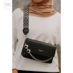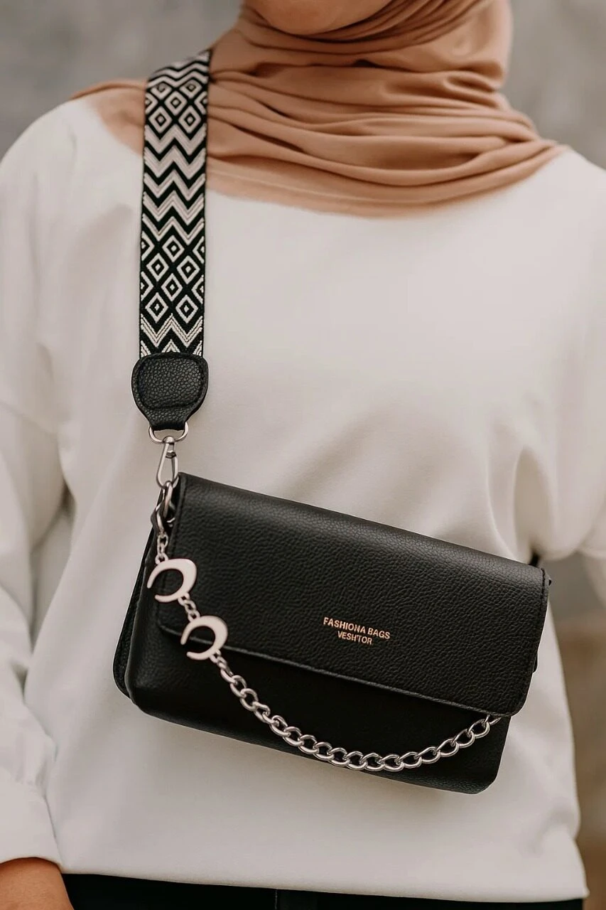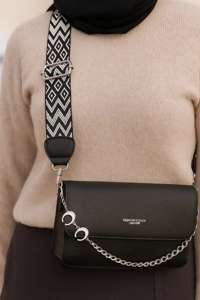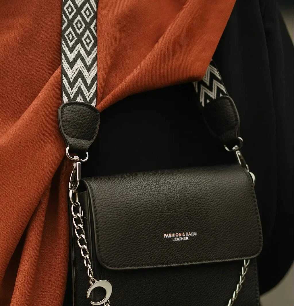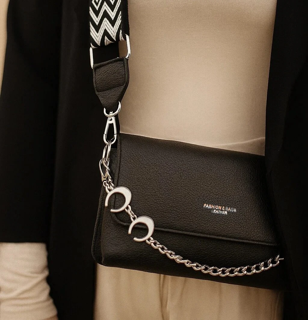 A sleek everyday essential, this black flap shoulder bag combines modern branding with timeless utility. Crafted from smooth leather, it features a bold front print reading “FASHION & BAGS LEATHER” that adds a contemporary edge to its clean design. The silver chain strap is paired with a contrasting geometric accent, creating a statement of style and structure. With its compact form and versatile appeal, this piece transitions effortlessly from daytime errands to casual evening outings.