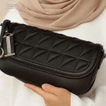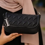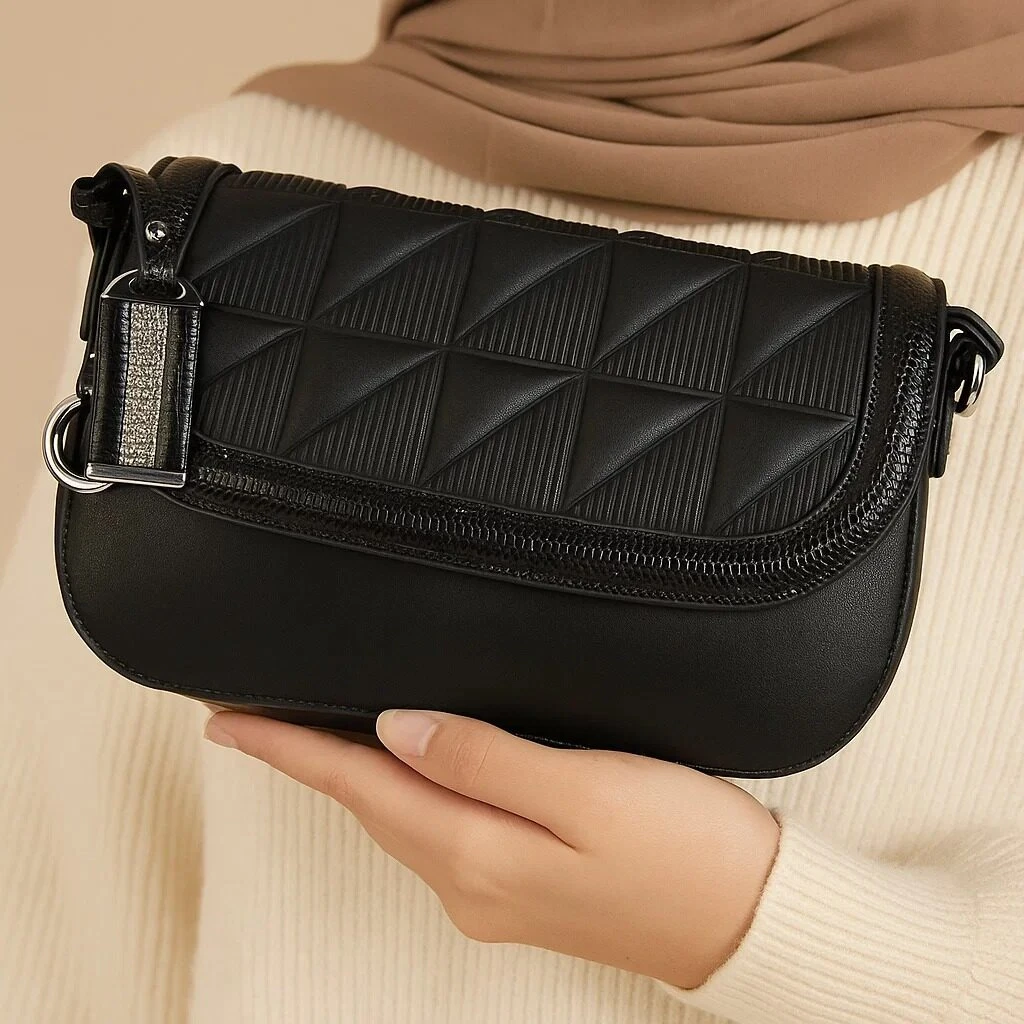 A bold black handbag featuring a quilted flap with geometric stitching, sleek texture, and silver-tone accents that add a sophisticated touch to everyday style.