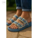 Step into laid-back sophistication with this light blue slide, featuring two wide straps accented by cream zigzag edge stitching and bold gold-tone buckles. The thick sole offers soft support, while the sleek color and clean design make it a versatile pick for effortless summer styling.
