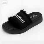 The slipper features a deep black color that gives it a chic and practical character simultaneously. The design stands out with a wide strap covering the forefoot, adorned with a shimmering “MIU MIU” logo, which may be made of rhinestones or crystals, adding a touch of sparkle and luxury to the slipper. The fringed edges on the upper strap provide a modern and bold touch, distinguishing it from traditional designs.