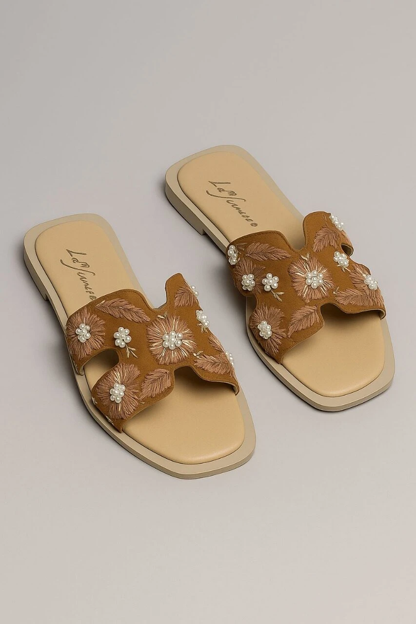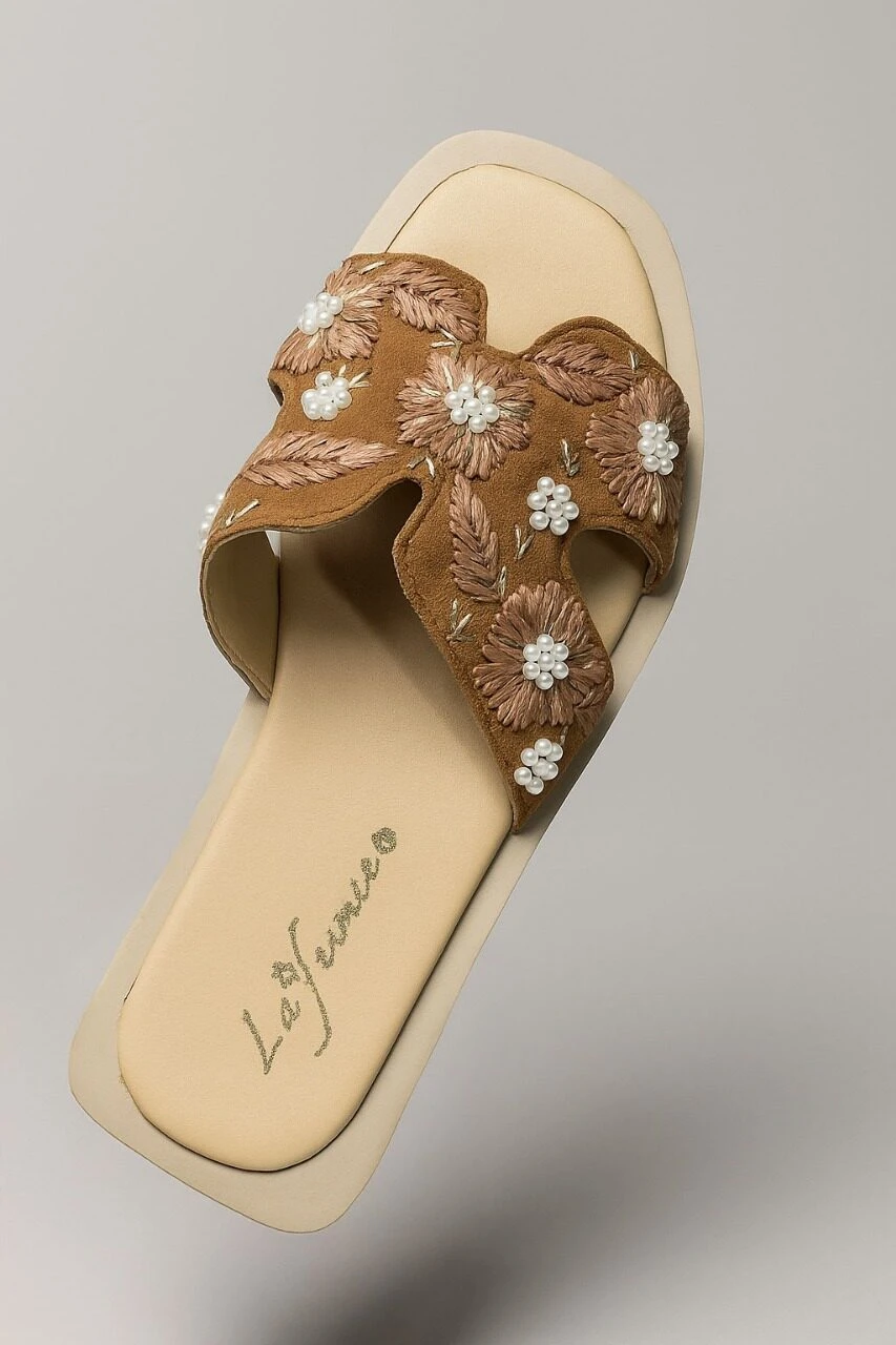 Designed with an open, easy slip-on style and a soft upper strap decorated with floral stitching and delicate pearl beads — perfect for everyday casual looks.