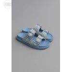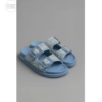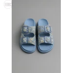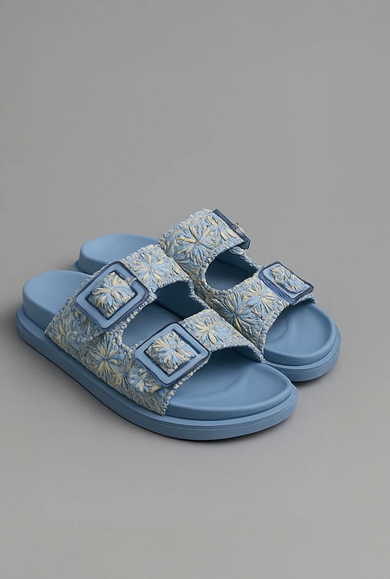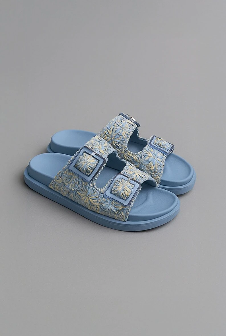 Woven Slide with Floral Pattern and Gold Buckles – Baby blue