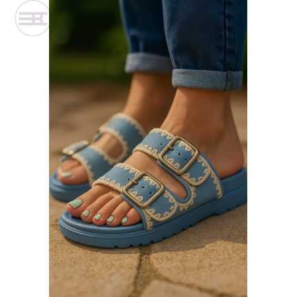 Slide with Zigzag Stitching and Gold Buckles – Baby blue